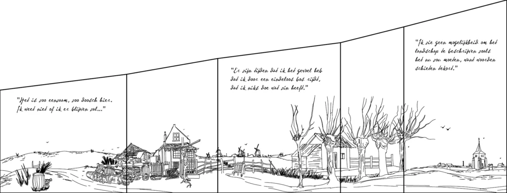 De buitenkant was versierd met een compilatietekening van een 4-tal tekeningen van Van Gogh. Elke tekening was een die sloeg op mijn verhaal, zo heb ik tekeningen uit Hoogeveen, Scheveningen, Nuenen en Etten-Leur gebruikt. De landschappen waar ik letterlijk doorheen ben gefietst